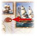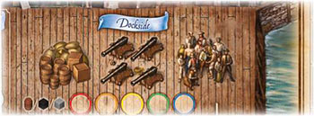 Up to 2 players may visit the Shipyard. The 1st player takes a Galleon and 1 Gun (black cube) and the 2nd player takes a Galleon.