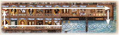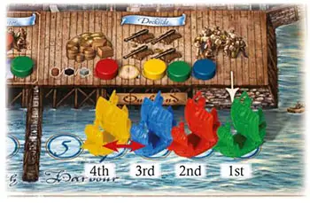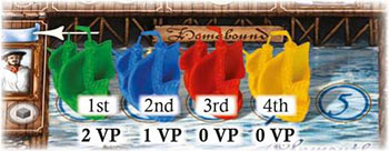 The players' ships in the Homebound Docks are all reduced to Frigates again, then reset in the following order, for the start of the next voyage: The player in last place on the Score Track goes in the first Dock, 2nd last goes in the 2nd Dock, 3rd last goes in the 3rd Dock etc. In case of a tie, the tied players remain in the same relative order as for the last voyage.