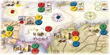 Shuffle the 3 Spanish Galleon Counters and place 1 face-up, on each of the 3 galleon icons on the board.