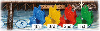 Example 3: Yellow has chosen the Governor, so he moves up into the 3rd Dock and pushes the Blue player back into Dock number 4. The sailing order is now Green, Red, Yellow, Blue.