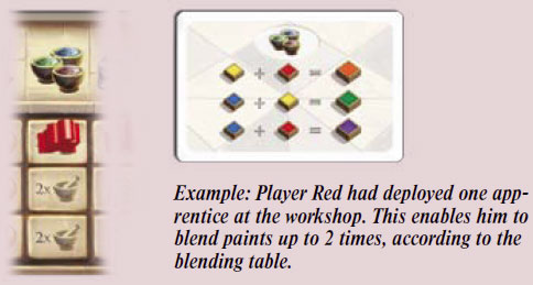 For each of their apprentices deployed at the "workshop" column a player may blend paints up to 2 times. It's the active player's decision which paints they want to blend. They simply return the blended paint pieces to the common supply and take the resulting paint piece instead.