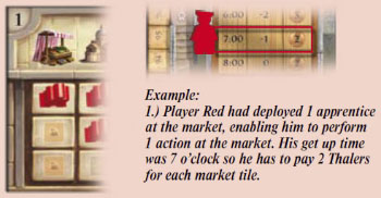 Each of the player's apprentices deployed at the "market" column may buy 1 market tile from the selected booth. Each tile can be bought only once. The purchase price depends on the player's previously chosen get up time.