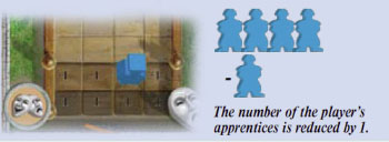 If a player's master painter is occupying any of the two "-1" spaces they have to dispense 1 of their own apprentices, placing him in front of their screen (thus having a total of only 4 actions during phase 2). When leaving these spaces they take their apprentice back and can use him again.