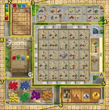 Placed in the middle of the table within easy reach for all players. The side for 4 players is face up (starting spaces S1 - S4).