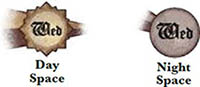 The time track has both day and night spaces. At dawn, the time marker advances from a night space to a day space, and at dusk, the time marker advances from a day space to a night space. Each day and night space has an abbreviation for a day of the week.