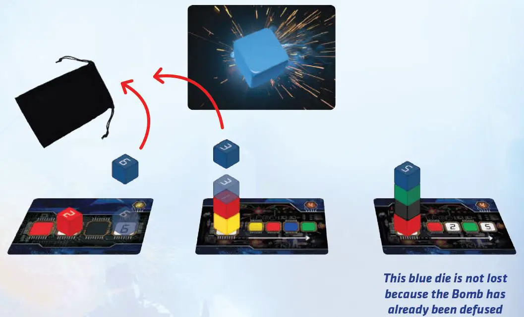 Note: If at any time it is found that a player has an incorrect die placement on a Bomb Card, the entire Bomb Card must be cleared and all of those dice placed back in the bag.