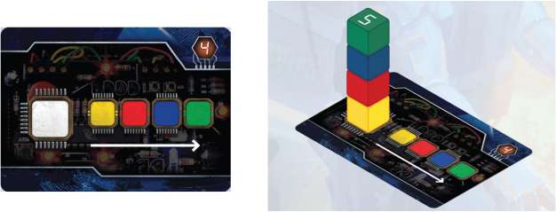 In the example above, a Yellow die must be placed first, followed by a Red die stacked on top of it, and then a Blue die, and a Green die.