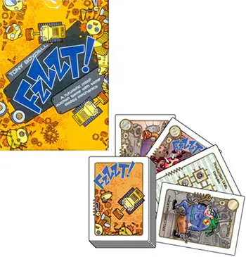 Fzzzt! is a five-round, set-collecting, sci-fi auction game with robots and production units individually sold to the highest bidder.