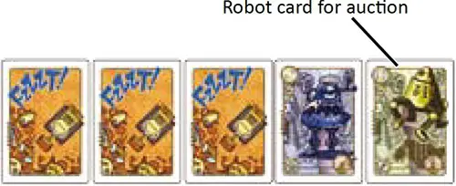 Players take the Robot cards marked with their Mechanic card number, so that each player has a 1 power, 2 power and 3 power Robot card. Together with the Mechanic card, these three cards form the player's hand at the start of the game.