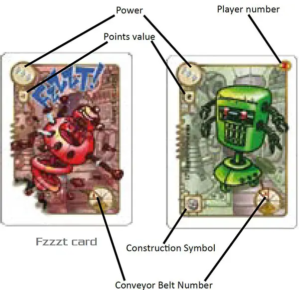 At the end of the game, each player works out their basic score by adding up the points value of each Robot card in their discard pile, cards in hand and cards allocated to Production Units. Fzzzt cards are worth minus one point each.