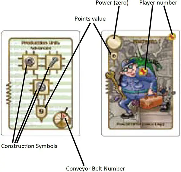 For example, if Anne has two Production Units in front of her, she may allocate one card to each Unit, but not two to one Unit. A Construction Symbol (nut, oil, cog, or bolt) on an allocated Robot card must match a Construction Symbol on the Production Unit.