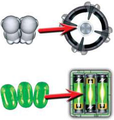 On each battery component , place 2 or 3 green tokens (depending on how many E-cells are depicted).
