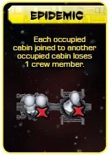 An Epidemic can strike in Round 2 or 3. This adventure card makes you remove 1 crew member (human or alien ) from every occupied cabin that is joined to another occupied cabin.