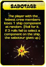Sabotage can occur in Round 3. This adventure card blows up a random component on the ship with the smallest crew. (If multiple ships are tied for the smallest crew, the one in front is sabotaged).