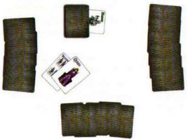 Place the remaining deck face down on top of the face-up card covering it only halfway. The face-up card is the trump color.