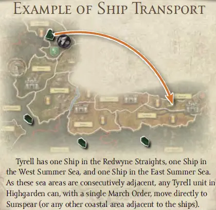 Any two land areas are considered adjacent for the purposes of marching and retreating when they are connected by consecutive sea areas (or a single sea area) each containing one or more friendly Ship units. In other words, Ship units in consecutively adjacent sea areas form a direct "bridge" for Knights, Footmen, and Siege Engines to move directly from a coastal area to another coastal area in one move.