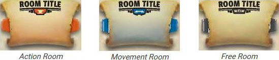Room tiles come in three different types: Action. Movement, and Free. The icon under a rooms title and the colored brackets to the sides of the scroll identify what type of room it is. The rooms are as follows: