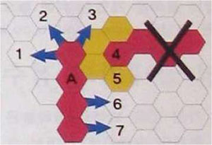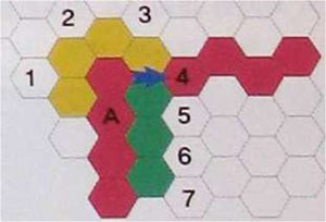 Red tile cannot be placed at location 4 because yellow tile has blocked the hexagonal edge radiating out the red tile on the left