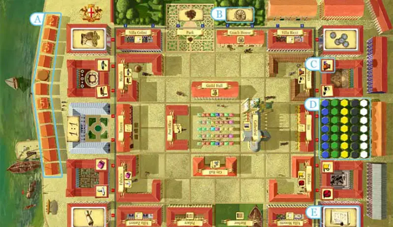 You are a merchant in the city of Genoa. The game board features a district of the city bordered by darker tiles. You will attempt to acquire wealth and fame in the various buildings identified with a banner.