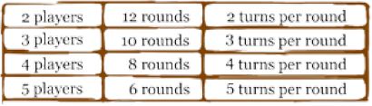 A game is played over 6 to 12 rounds, each of which are divided into turns. There are as many turns per round as there are players.