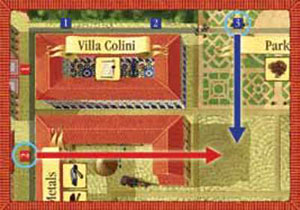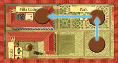 Example: Jeff observes that the tower still has enough discs to reach Villa Colini. Since the tower is not adjacent to Villa Colini, Jeff cannot make a deal with the merchant yet.