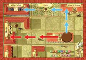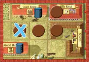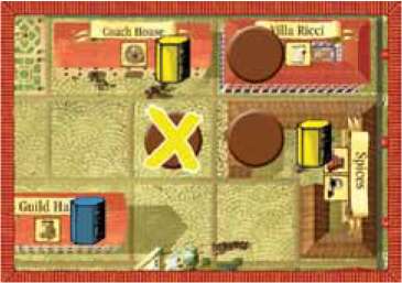 Example: The merchant is the first player to be able to place one or two Ownership markers. He chooses the street space adjacent to the Guild Hall and the Coach House (a disc can be found there).