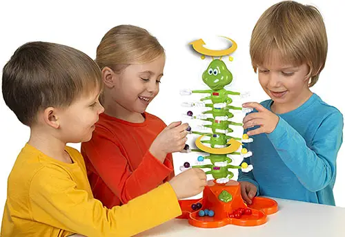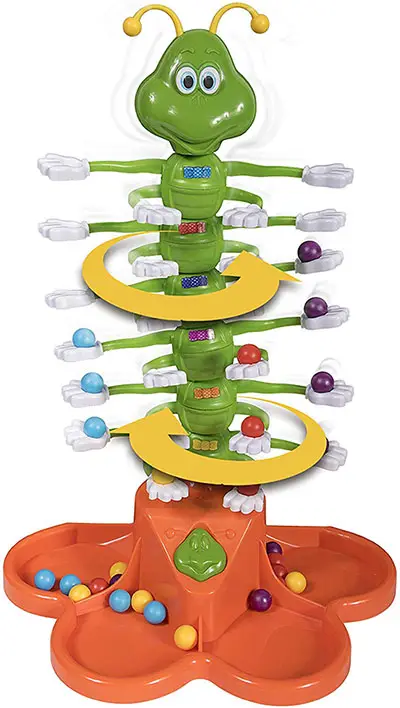 Press the caterpillar button to start Giggle Wiggle moving! (Press again if you want to turn the game off). The race is on! Using your fingers, place your colored balls in the hand above your base section and work your way to the top.
