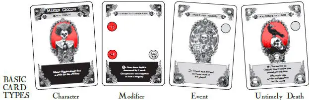 The basic Gloom game uses 4 types of cards: Characters, Modifiers, Events, and Untimely Deaths. Cards are resolved in the order in which they're played.