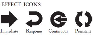 Persistent Effects: These appear only in Gloom expansions. They trigger when the card is played, but remain in effect even after the card and its effect text is buried; an icon in the top right story icon space signifies this, along with a text reminder in the center of the card under the illustration.