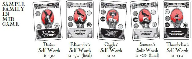 Add up the visible Self-Worth points of all your own dead Characters to get their Self-Worth scores, and total those to get your final Family Value. The player with the lowest Family Value wins the game.