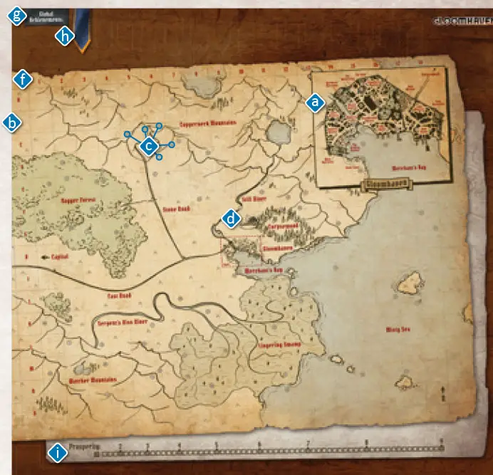 The campaign board is used to track the global progress of the game world. The locations, achievements, and prosperity tracked on the board apply globally to all parties playing in the world.