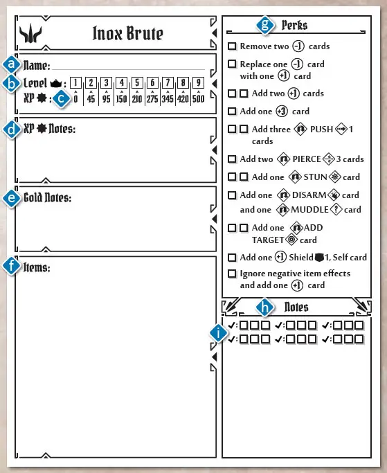 When a new character is created, the player should start a new entry in the character's corresponding character sheet notepad. As players play through a campaign, they will need to keep notes on what experience, gold, items, perks, and available ability cards they have in their deck by using this character sheet.