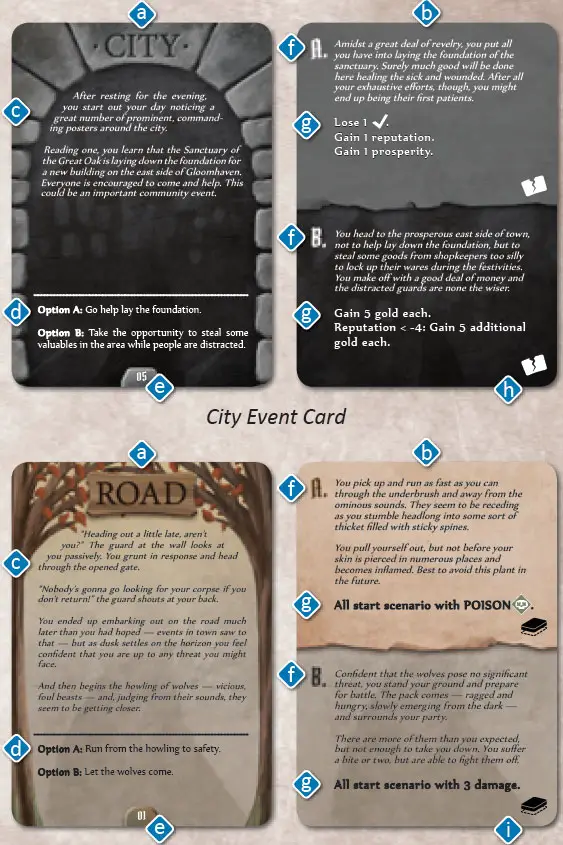 Players will have many opportunities to encounter city and road events throughout a campaign. When players encounter an event, they draw the top card off the corresponding deck and read the front side a. Note that event cards have content on both sides, and the back b should not be read until the front is resolved. City events and road events have different art and content, but they work the same way.