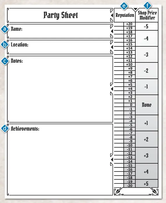 A party is formed when a new group of players gets together to play the game. They will document the formation of the party by starting a new entry in the party sheet notepad. Party achievements, reputation, and location will be tracked on this notepad.