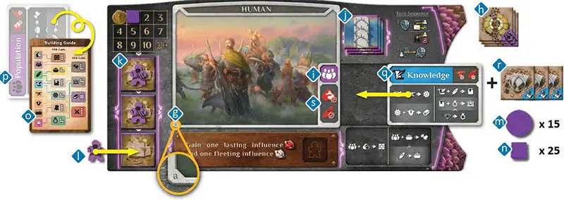 Randomly determine a starting player and give that player the active player token. Player order will be determined from the starting player and go clockwise around the table. In player order, players will choose a race, collecting all of the following: