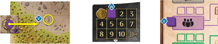 Each house tile built immediately unlocks an additional worker pawn for the player. These are sometimes used when performing a basic action. In addition, when collecting income, each house built by a player gives him or her 1 fleeting influence g.