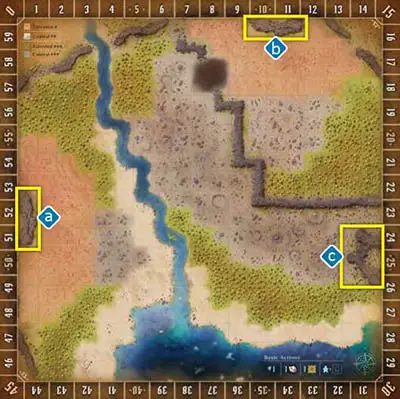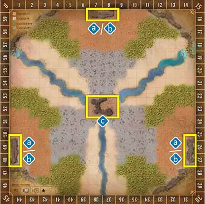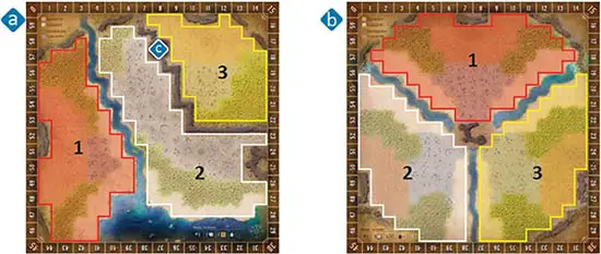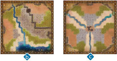b, with the compass rose in the bottom right corner, is meant to emulate the ruins upon which Gloomhaven was built.There are fewer total spaces, and the river and walls have more restrictive placements, creating a much tighter board that could lead to more instances of aggressive blocking moves by the players.