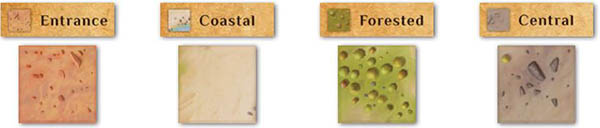 Each buildable square on the board is one of four different terrain types, which have implications for what buildings can be placed on them, and the cost of importing or buying access to resources on those squares. The four types are entrance (red), coastal (white), forested (green) and central (grey).