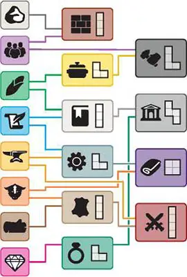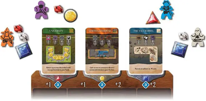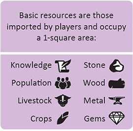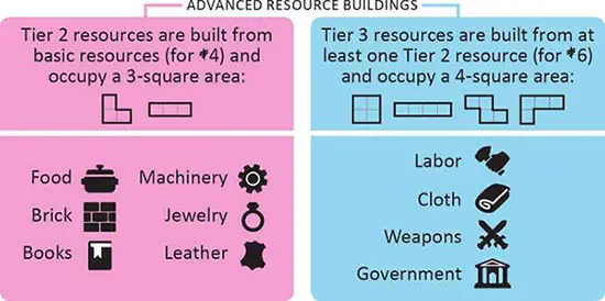 Tier 2 and 3 resource building tiles can be placed on any terrain color, but each city section can only have one resource tile of each type. Resources used to build the higher-tier resource building, including the player's own buildings, earn points for the player who owns them, depicted by values on the tile being built.
