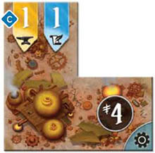From those 4 points, however, the owner of the machinery tile must pay out the machinery prerequisites again (see example 1), so the owner of the knowledge earns 1 point, and the owner of the metal earns 1 point, leaving 2 points remaining for the owner of the machinery tile.