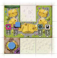 If two cards of the same building type are drawn in the same set of three, place the rightmost one on the top of the draw deck and replace it. Each building also has a specified color, and can only be placed on the board such that at least one space of the building is on the corresponding terrain type, the building does not overlap a road tile, building tile, or unbuildable space, and there is not a prestige building tile of the same type (both shape and color) in the same city section.