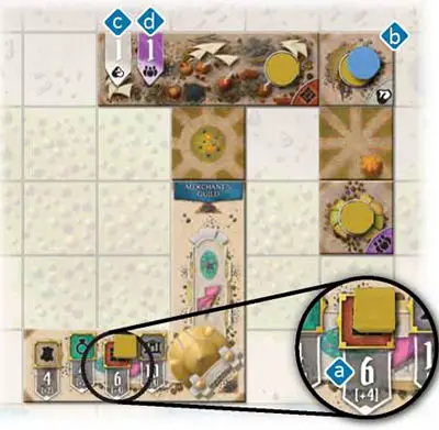 After this, in reverse player order, starting with the last player, each player places one of their race's resource trade stall tiles on any of the empty grey spaces on the board specially marked with a number equal to or lower than the player count v, then places one of their claim tokens on top of the tile.