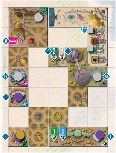 This means that if a player wishes to build a machinery resource building tile, they can only place the tile such that it is connected to its prerequisite resource tiles, and the player has a claim token on each of those resource tiles.
