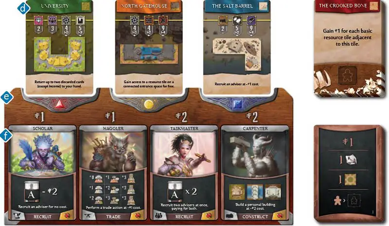 Deal out three prestige building cards d from the bottom of the deck to the three spaces at the top of the adviser and proposal board e and deal out four adviser cards f to the four spaces at the bottom of this board (the adviser offer).