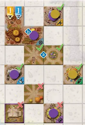 Example: All tiles marked with a green check are connected to the machinery resource building tile. Those with a red X are not.