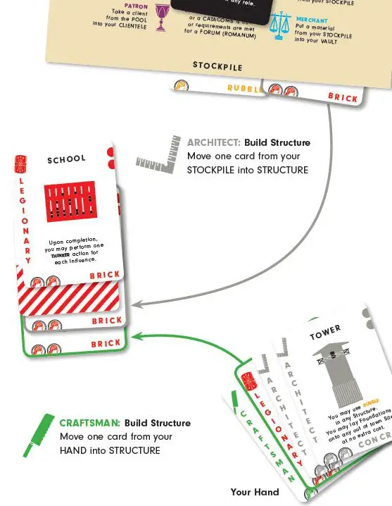 You perform Architect and Craftsman actions in order to build Structures and restore glory to Rome.