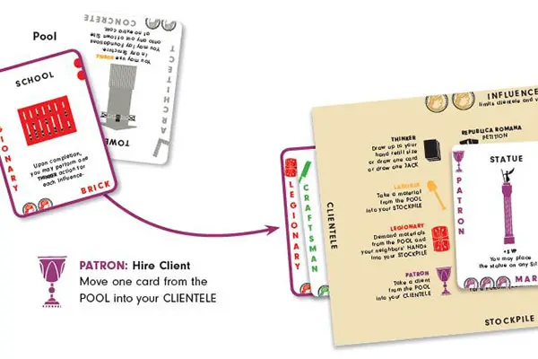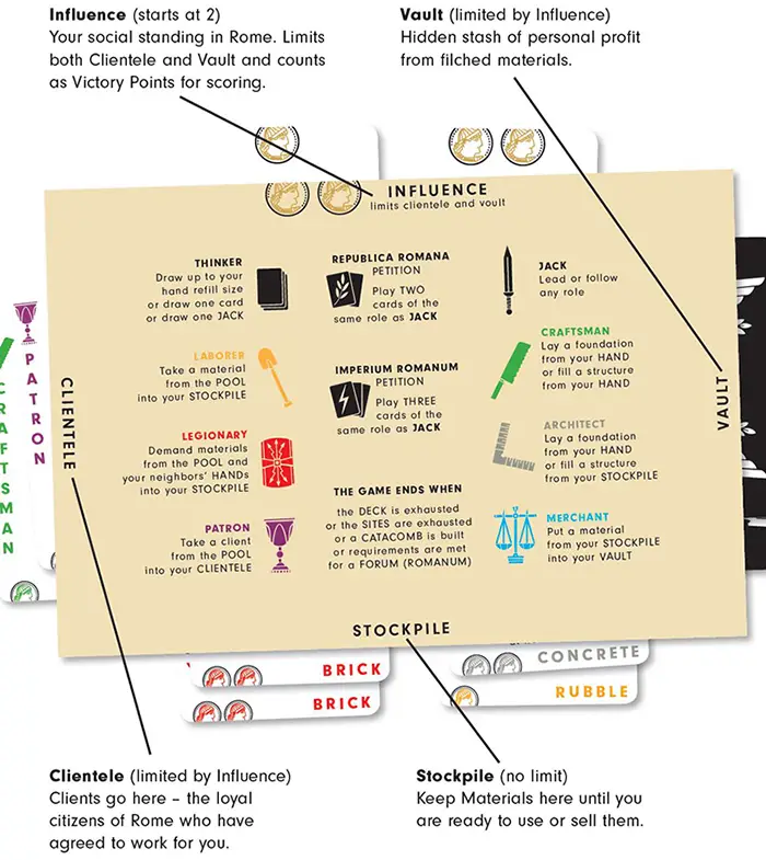 During the game you hire Clients and gather Materials to help rebuild Rome (or your personal fortune). Your Camp card organizes your Clients and Materials, and also tracks your growing Influence.