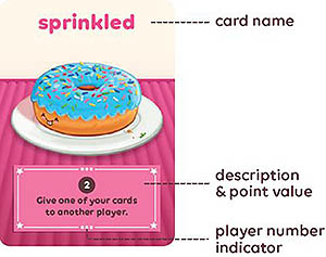 Create the donut deck by adding or removing cards according to the number of players. Each card has a colored background and dots around its description box that indicate the minimum number of players it takes to include that card in the game.