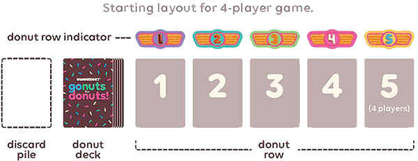 Place a donut row number indicator above each card in numerical order, starting with the card closest to the deck and moving to the right. (The card closest to the donut deck will be referred to as card 1, the next donut card is card 2, and so on). These indicators will stay in place throughout the game.