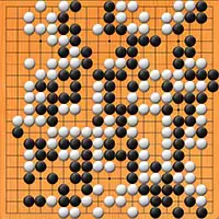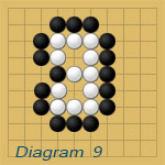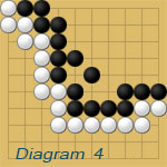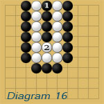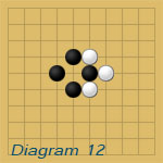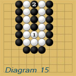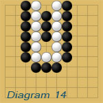 Bekijk diagram 14 opnieuw. Als wit speelt, wordt de hele groep gevangen. Als zwart speelt, zal wit 4 zwarte stenen vangen en krijgt het 4 punten.
